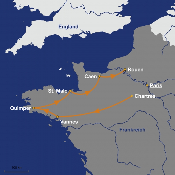 Am Anfang dieser Reise steht Chartres mit seiner wunderschönen Kathedrale auf dem Programm. Die Fahrt geht dann weiter in den wilden Westen Frankreichs u.a. mit dem Besuch der Megalith-Felder von Carnac und der Festungsstadt St. Malo. Die Abtei Mont-St. Michel ist ein einmaliges Erlebnis. Zuletzt wird Sie das Städtchen Honfleur an der Côte Fleurie mit malerischen Häfen und französischem Flair begeistern.