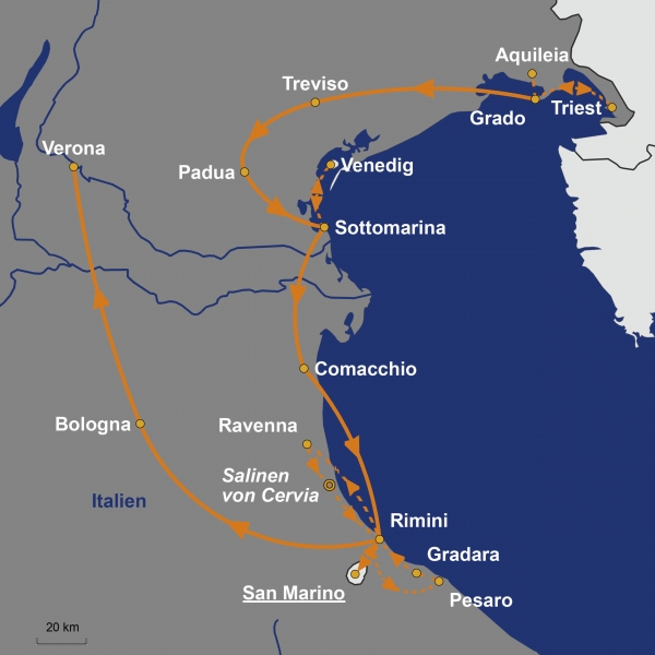 Diese abwechslungsreiche Rundreise entlang der nördlichen Adria verbindet eindrucksvolle Städte, kulturelle Höhepunkte und mediterranes Flair. Sie entdecken unter anderem das elegante Triest mit seinem habsburgischen Charme sowie die Lagunenstadt Venedig mit dem berühmten Markusplatz. Weitere Höhepunkte sind die Mosaikstadt Ravenna oder der Zwergstaat San Marino. Freuen Sie sich auf eine Reise voller kultureller Schätze, schöner Küstenlandschaften und italienischer Lebensfreude.