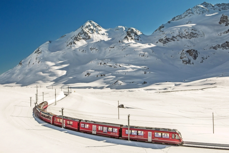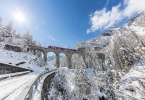 Mit Ihrem Bus fahren Sie über den Julierpass ins Engadin. In Pontresina beginnt die herrliche Bahnfahrt mit dem Bernina Express, eine der weltweit schönsten Bahnstrecken. Genießen Sie die spektakuläre Alpenüberquerung durch eine märchenhafte Winterlandschaft. Am Berninapass haben Sie freie Sicht auf die verschneiten Bergspitzen und Gletscher. Das berühmte Kreisviadukt bei Brusio erwartet Sie kurz vor der Endstation Tirano. Hier können Sie ein typisches Veltliner Mittagessen genießen, bevor Sie die Rückfahrt im eigenen Bus antreten.